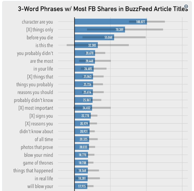 That article is focused around the following chart (sort of), which shows BuzzFeeds most successful clickbaiting phrases. The chart highlights appeals that are most likely to cause clicks. The first and third top phrases, for example, both appeal heavily to emotion; the first likening a reader to a character (probably one they like) and the next expressing the urgency of mortality. If someone tells you to do something before you die, chances are you might be inclined to listen, and it is that emotional appeal that this phrase employs.