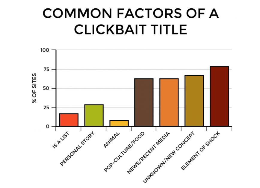 Clickbait titles often employ strategies like mystery, shock factor, and emotional appeal to goad you into clicking. “Find out more”, “You won’t believe”, “Which _____ are you most like”, “The shocking truth behind ____” are all common formulas to get you curious about what’s packaged underneath the title. The chart below shows common attributes of online titles that have been identified as ‘clickbait’. Most of these categories fit in the lines of something that either picks at your curiosity, or something that is designed to feel personable.