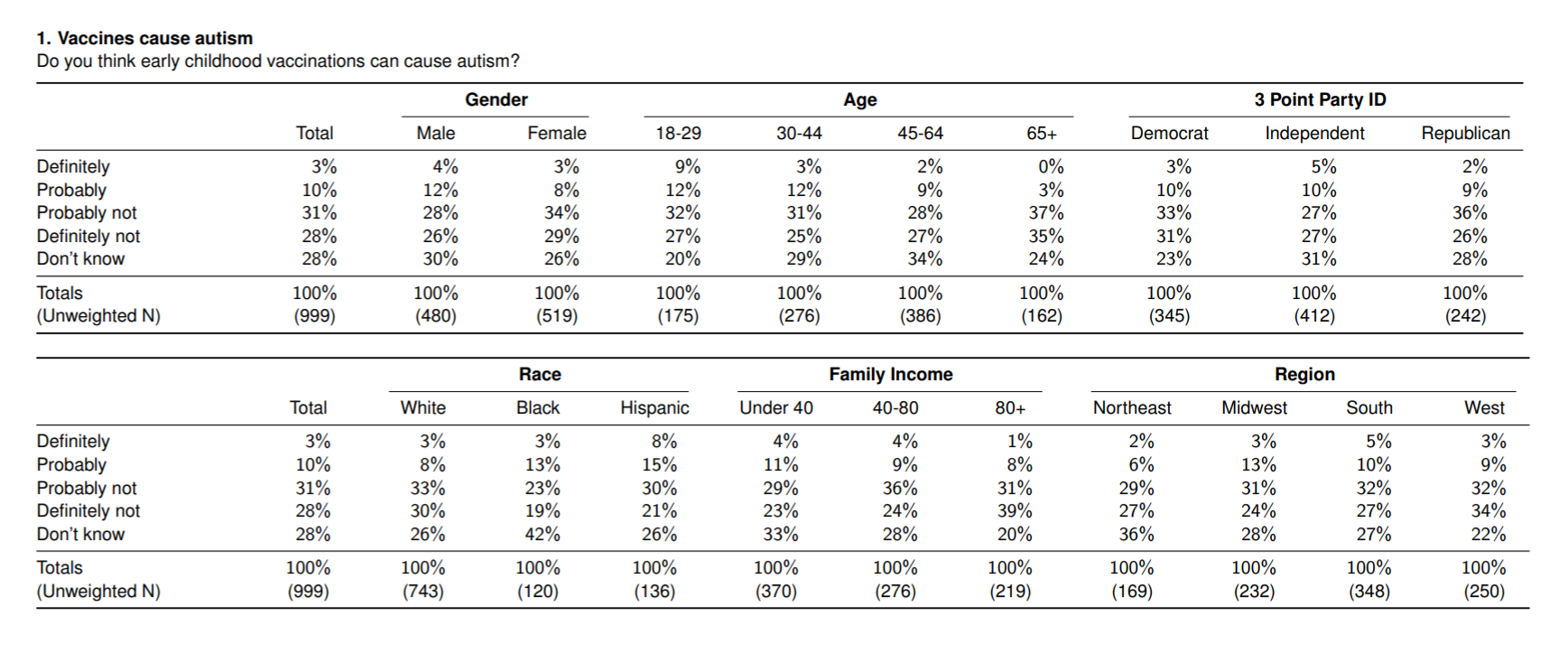 While the data from this survey might be helpful in answering questions related to people’s beliefs of vaccines and autism, it isn’t wholly representative of American and even human/world views. YouGov collects data via online surveys and offers cash prizes to those who participate after they have accumulated a certain amount of points. This means that the people who are represented in these results all willingly took this survey most likely because they were receiving a cash prize, and they are all people who have accounts with YouGov, not general internet participants. An example of this being incomplete representation is the idea that more millennials use the internet than older people, so millennials overall are being better represented, whereas individuals 65+ are being generalized by those who happen to use the internet, have YouGov accounts, and chose to participate in this poll. These are some general issues with online surveys and point out some things to consider when finding data to rely on to answer questions.