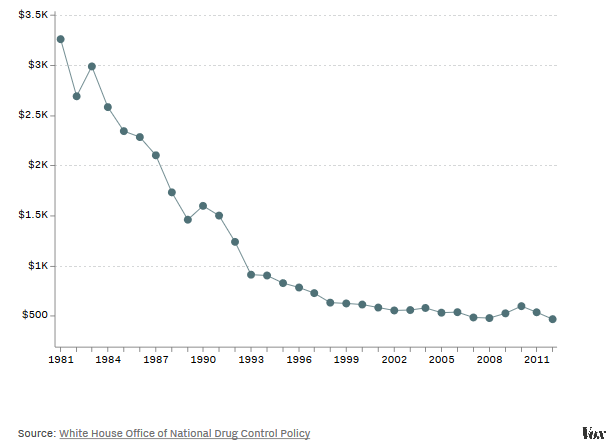 While the graph above shows what happened it doesn’t really show why. According to the Vox article many opioid users switched to using heroin because it’s so cheap, often cheaper than candy bars. The graph below shows that heroin cost $3260 per gram in 1981 and dropped to $465 per gram by 2012, thus making the drug much more available and cheaper than prescription painkillers. The CDC states that individuals who use prescription opioid painkillers are 40 times more likely to use heroin and 45% of heroin addicts are also addicted to prescription opioid painkillers. Many states have even set a limit of 7 days for opioid prescriptions and this too has driven people to find other means to satisfy their need which has led many to start using heroin. Others have turned to fentanyl. Not only is it more potent (50-100 times more potent than morphine) than other opioids, when illegally made it is even cheaper than heroin. However many deaths from this drug are actually due to it being laced in heroin and cocaine because of its low-cost and increased euphoric effects. People who buy the laced drugs are not often aware of the fentanyl and accidentally overdose.