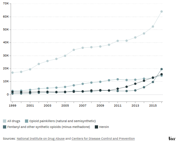 When most people think of America’s opioid crisis the first thing that generally comes to mind is prescription pain pills. Over the last two decades the U.S. has faced a deadly epidemic. An article on Vox.com asserts that it was started by what was intended to change pain management for the better, legal prescription drugs such as Oxycontin and Percocet prescribed by your family doctor. Ever since 1999 pain killer deaths have been on the rise, however the U.S. is now facing bigger problems amidst this crisis. In 2010 the epidemic started to change and something interesting happened; heroin related deaths started to sharply increase. By 2013 deaths by another drug called Fentanyl, a synthetic opioid, started to rise. By 2016 both heroin and Fentanyl contributed to more deaths than opioid painkillers alone and the Fentanyl death rate even surpassed deaths due to heroin, rising 264% between 2012 and 2015.. The graph below is a visual representation of the lives taken during the U.S. opioid epidemic spanning the last 20 years.